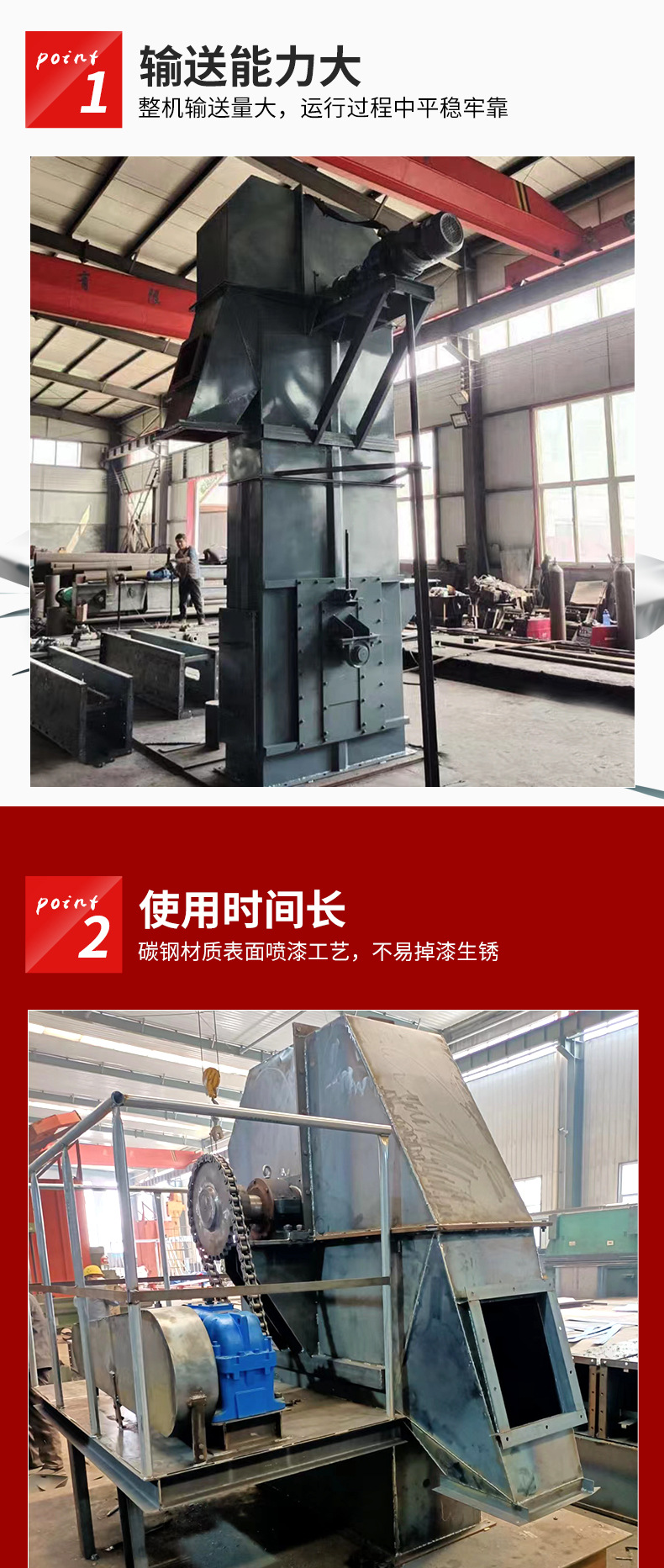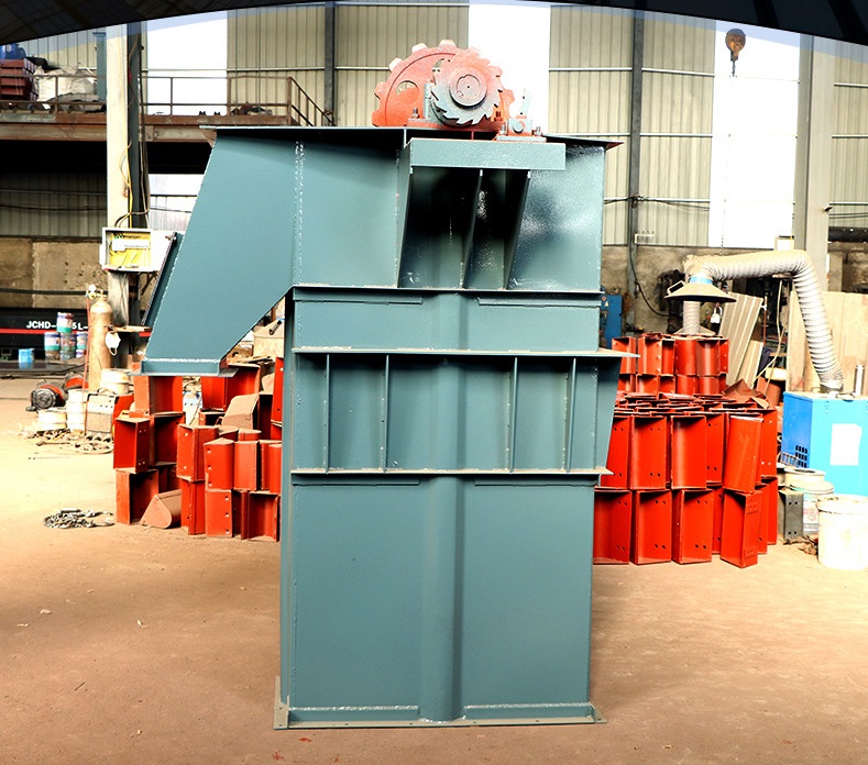 3、中部機殼分單,雙通道兩種形式。雙通道主要是加強整機的中間節(jié)強度,一般的單通道斗式提升機是料斗的上行和下行都是在一個機殼通道內(nèi)。雙通道環(huán)鏈斗式提升機在同等條件下,提升量要比單通道垂直提升機提升量高30%左右。