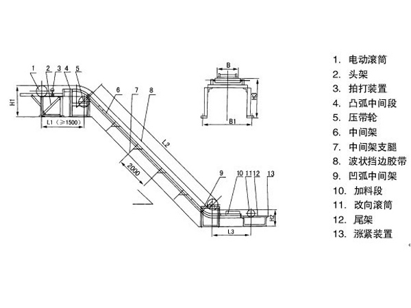 (1)、大傾角皮帶輸送機(jī)為一般用途的散狀物料連續(xù)輸送設(shè)備,但采用的是具有波狀擋邊和橫隔板的輸送帶。因此,特別適用于大傾角及垂直90°輸送。