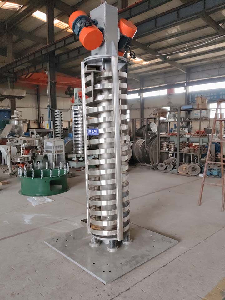 不銹鋼垂直振動(dòng)提升機(jī)是對(duì)食品、醫(yī)藥等對(duì)衛(wèi)生要求比較嚴(yán)格、或者是有腐蝕性的顆粒狀、塊狀、粉狀的固體物料的輸送,是我廠生產(chǎn)的一種新型的垂直振動(dòng)輸送設(shè)備。采用振動(dòng)電機(jī)作振動(dòng)源,利用兩振動(dòng)電機(jī)的合成振幅,將物料沿螺旋輸送槽向上輸送。